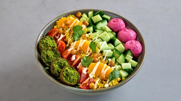Orangen- Couscous | Grünzeug | Gurke | Tomate | Pink Hummus | Falafel | Limetten Aioli