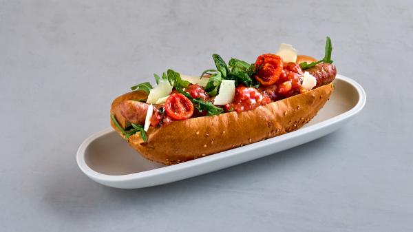 Sauerteig Bun | Salsiccia | geschmorte Tomaten | Rucola | Parmesan